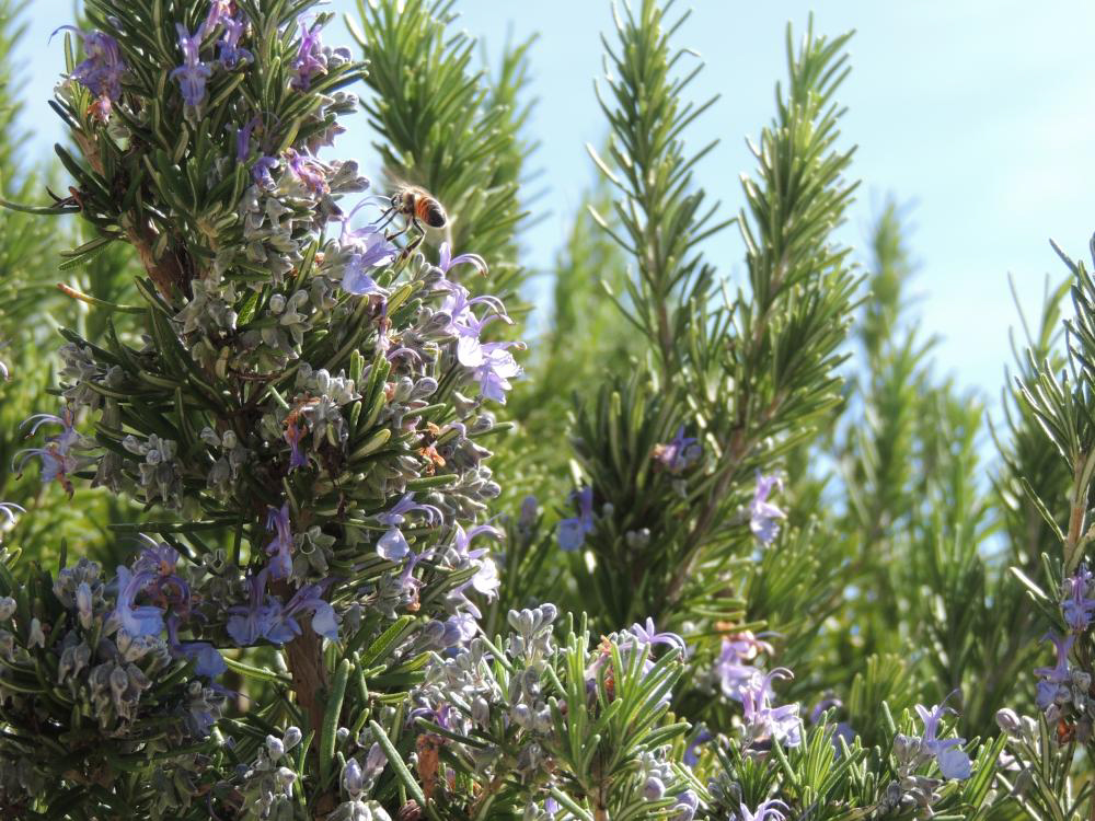This photo captures the moment that a bee is landing on a rosemary flower on a sunny day. Its wings are a blur of movement while its body is momentarily still as it prepares to gently touch down on the purple flower. The gentle sunlight, soft green of the rosemary leaves, and delicate purple of the blooming flowers evoke a warm spring day full of fresh starts and new growth. The bee is hard at work pollinating flowers as it buzzes around, pausing only briefly to land on various flowers before taking off in search of the next landing spot.